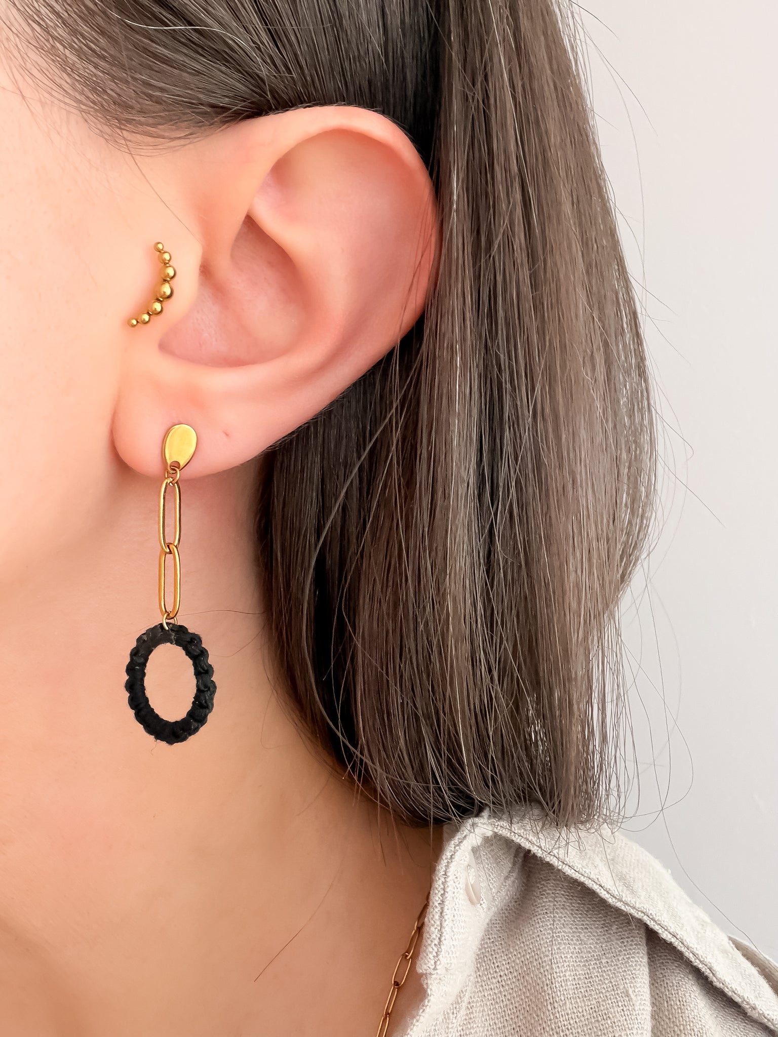 This elegant set of earrings features paperclip chain and fine macrame design, creating a stylish and trendy look. Made with hypoallergenic, waterproof, and tarnish-resistant gold stainless steel, these earrings are perfect for everyday wear. Upgrade your jewellery collection with these statement earrings that combine fashion and functionality.